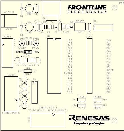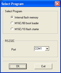 On-Board Flash Programming.Serial programming software M16C Flash Starter (free software) is available for programming the flash memory of the R8C micon. Use the executable file Flashsta.exe for programming. Before programming, you have to carry out certain jumper settings. To select the serial port 1 of the micon, use jumpers JP4 and JP6. Place the jumper on C side for both JP4 and JP6. This connects the serial port 1 lines to the level shifter MAX 232. Connect the serial port cable between the PC and the board at the connector CON3 marked as "TO PC (FLASH PROGRAMMING)'. Put the jumper on ‘PROG’ side for JP2 to enable the programming mode.