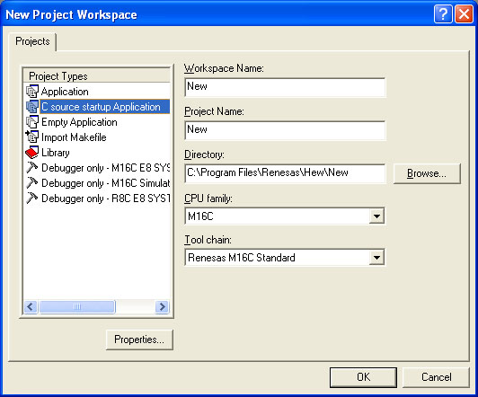 Introduction.Renesas’s HEW 4.0 is used for developing application programs. Each program is opened as a separate project and the related files are stored in the relevant project directory. In the HEW, open a new project by selecting New workspace from the main menu. Select the option “C source startup Application” from Project Types, M16C option from CPU family and select tool chain as Renesas M16C standard. Enter the project name and select the location using Browse button.