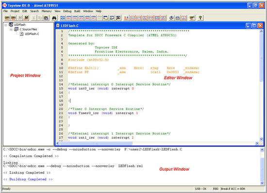 This is the arrangement of windows to write a program and compile the same. The Project window shows the files in the project. You edit or type your program in the editor window and the Output window will show the output of the compiler. Editor window supports color syntax facility to make the programs easy to understand.