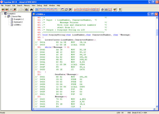 Software Facilities: Emulation Memory: Topview ICE - B provides 60 Kbytes of space for the program memory. Software BreakPoints: Software BreakPoints allow the real time program execution until the specific program line. Conditional BreakPoints: A set of conditional breakpoints permit the program halting during the emulation based on specific code address, source code lines and the register contents. Language and file formats: Topview ICE - B accepts files with many formats. It also accepts different assemblers and C languages. For the ASM program, Intel Hex format is accepted. For the C environment, both KEIL and SDCC compilers are supported. Source Level Debugging: The Topview IDE comes with a Source Level Debugger which helps the designers debug the application code generated by both the assembler and the C language. This debugger includes the commands to generate all the required information during the program and hardware testing in real time. The commands permit setting breakpoints based on high level language lines, adding a watch window with symbols and variables of interest, modifying the variables, executing assembly steps and many more useful functions. Topview IDE - Integrated Development Environment