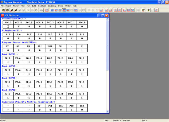 Memory window. You can view Mnemonics, Address, SFR Bits, SFR Registers in different